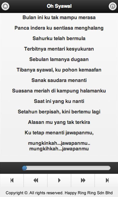 Selamat hari raya pada saudari saudara semua marilah dengan gembira merayakan aidilfitri yang mulia. Aidil fitri hari bahgia hari yang mulia mohon maaf bersama dipinta selamat… selamat hari raya. Aidilfitri hari bahgia hari yang mulia mohon maaf bersama dipinta selamat, selamat hari raya. Di masa bulan remdan kita berpuasa hingga sebulan pabila syawal menjelma hari raya disambut dengan gembira. Diharap supaya jangan disimpan kuberdoa selamat panjang umur murah rezeki semoga tuhan akan memberkati. Seruan kita untuk semua selamat… selamat… Selamat hari raya pada saudari saudara semua marilah dengan gembira merayakan aidilfitri yang mulia. Selamat hari raya hari suci mulia kepada muslimin muslimat semoga bahagia. Sembah salam ayah dan bonda ampunkanlah dosa hilangkanlah duka dan nestapa selamat… Maaf lahir dan batin halal makan dan minum kepada teman dan saudara selamat berhari raya selamat berhari raya hari suci mulia hari suci mulia. Yang salah kita maafkan yang jauh kita rapatkan semua kita saudara bulan mulia kini tiba. Mari teman mari saudara kita bergembira lupakan hatimu yang duka selamat… Selamat aidilfitri kepada saudara serta saudari setahun hanya sekali merayakan hari yang mulia ini.